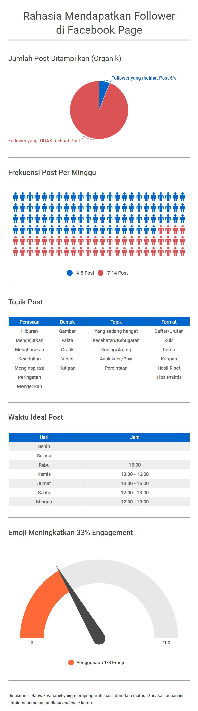 Tahukah kamu meski punya ratusan ribu atau jutaan Facebook fans bukan berarti engagement (atau interaksi antara konten dengan fans/followers) yang kamu post di Facebook Page juga secara otomatis meningkat. Salah satu alasannya karena Facebook sengaja membatasi hanya 6% (atau kurang) dari total follower yang bisa melihat post kamu secara organik di News Feed mereka sehingga Facebook menganjurkan untuk memasang iklan berbayar di Facebook.