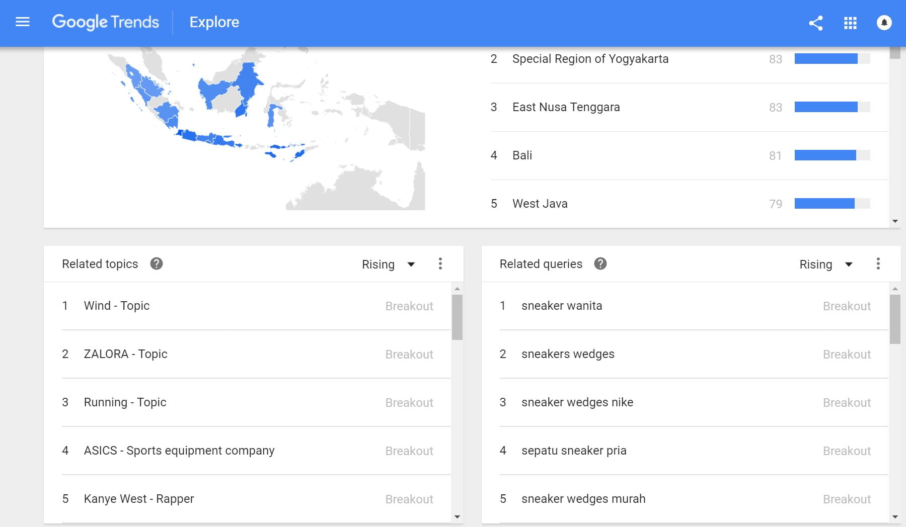 Kamu bisa juga menggunakan Google Trends sebagai bantuan kamu dalam mencari ide artikel. Di Google Trends, kamu bisa tahu berapa banyak orang yang mencari dengan kata “sneaker” di Indonesia dalam rentan waktu tertentu serta kamu juga bisa tahu topik apa yang banyak dicari orang yang berkaitan dengan “sneaker”.