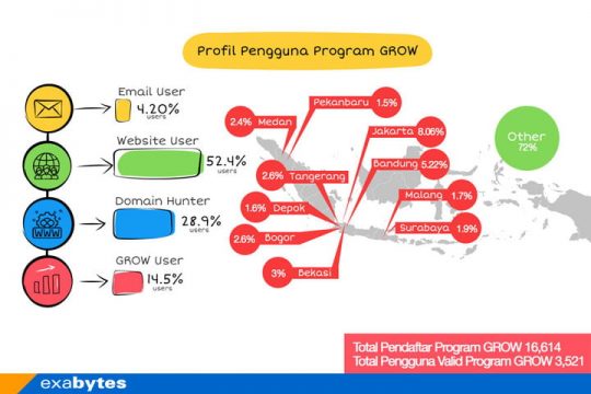 Pada Maret 2017 yang lalu, Exabytes Indonesia mulai gencar menunjukkan keseriusannya dalam menggarap segmen UKM/UMKM melalui program GROW dengan memberikan 5,000 domain gratis untuk mewujudkan misi mendigitalisasikan sebanyak-banyaknya UKM/UMKM Indonesia. Seiring berjalannya waktu, program GROW semakin eksis di kalangan UKM/UMKM maupun publik, dengan meningkatnya jumlah pengguna pendaftaran program GROW menjadi 16,614 pendaftar.